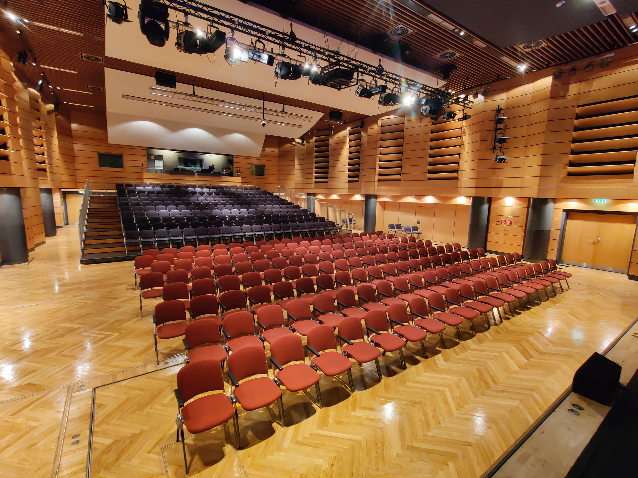 Speziell für Theater- und Musical-Produktionen lässt sich der Saal durch eine optionale Tribünenbestuhlung im hinteren Bereich in ein klassisches Auditorium verwandeln. Die erhöhten Sitzreihen garantieren dabei von jedem Platz aus perfekte Sichtlinien auf das Bühnengeschehen.